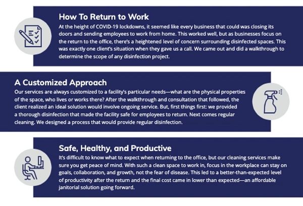 Call on Blue Moon to help. The COVID-19 pandemic presented several challenges to building and business owners, with how to maintain a clean space high on the list. Blue Moon helps companies bring their employees back to the office and enhance productivity in the process.